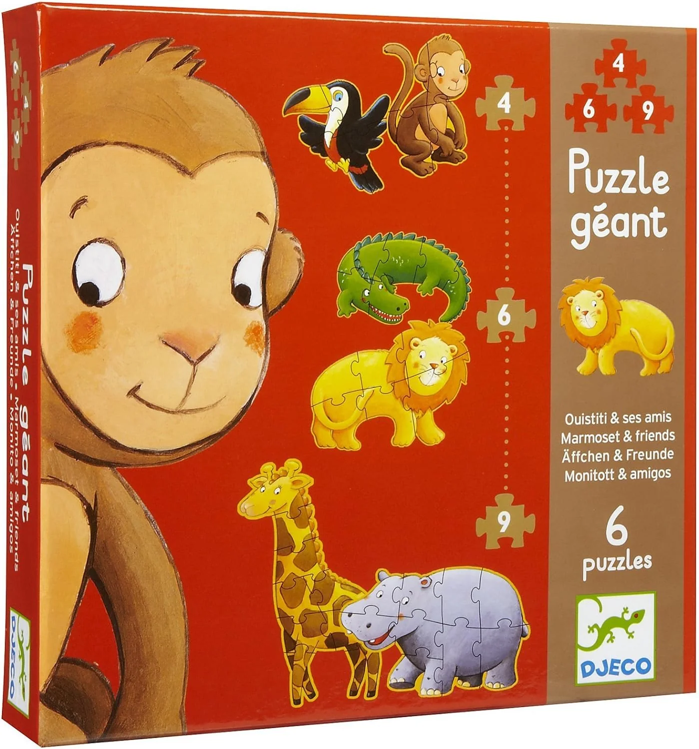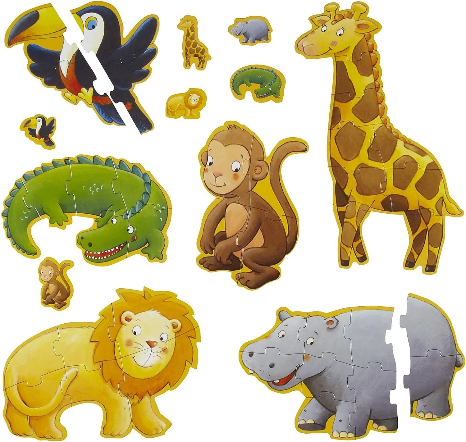 Dos puzzles de 4 piezas, 2 de 6 piezas y 2 de 9 piezas, para aumentar la dificultad a medida que se gana habilidad en el armado de los puzzles.