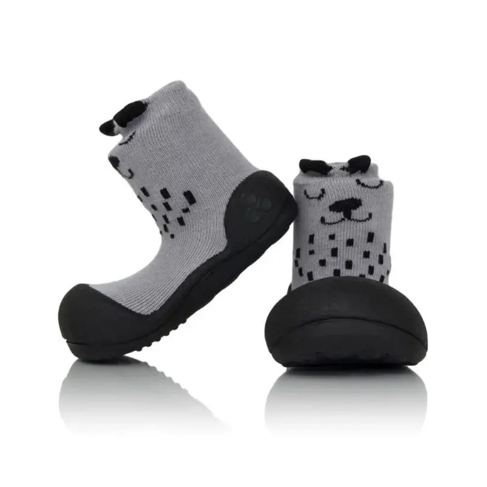 Calcetines antideslizante gris con un diseño tierno de oso para que los primeros pasitos del bebe sean seguros.