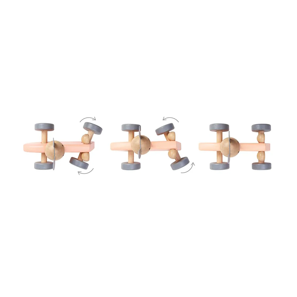 El vehículo tiene un diseño de auto de carreras antiguo y cuenta con una rueda giratoria que realiza el mismo movimiento que un auto de carreras real cuando gira.