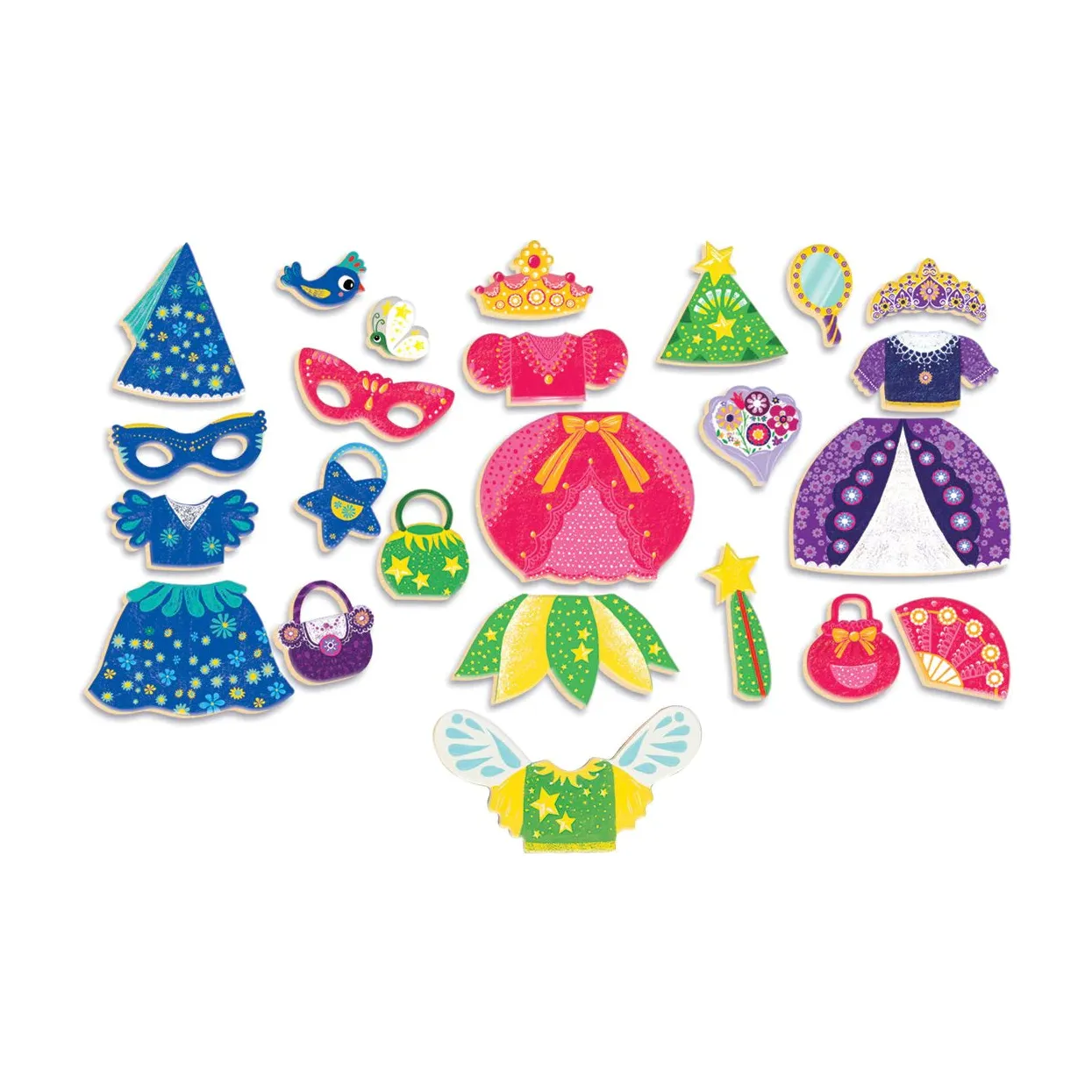 - 27 piezas de madera magnéticas para vestir y completar los looks con accesorios