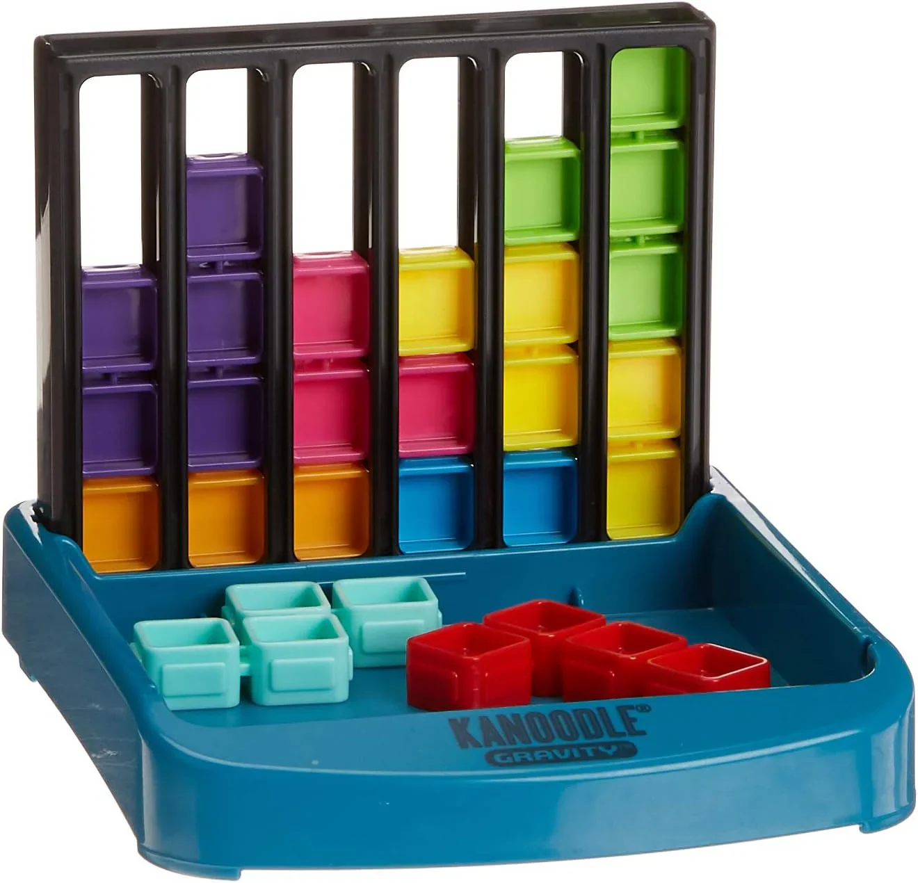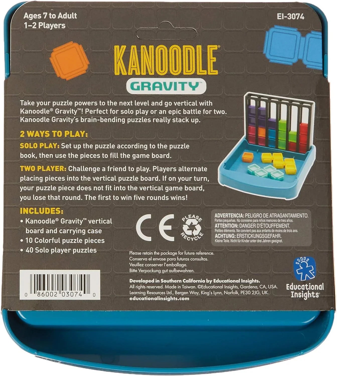 Incluye tablero de rompecabezas Kanoodle Gravity, 10 piezas de rompecabezas de colores, guía con desafíos de rompecabezas y estuche de transporte.
