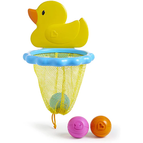 Juguete de baño Munchkin es un aro de pato que se ajusta para formar una red y tres coloridas bolas de baño que arrojan agua cuando su hijo las aprieta.Su niño pequeño puede desarrollar habilidades táctiles mientras busca devuelve las tres pelotitas y divertirse.