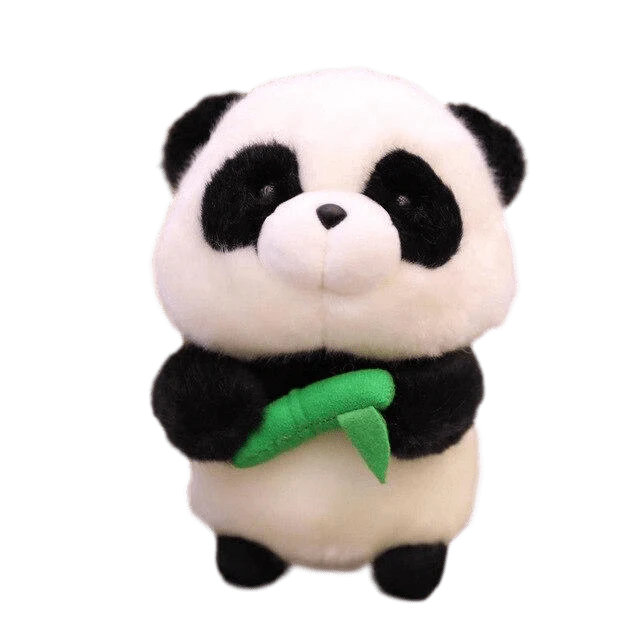 Este Peluche Panda Pequeño probablemente salió de la mesa y comió demasiado bambú. Tiene una cabeza redonda y hermosos colores en blanco y negro. Sus pequeñas manos llevan dos hojas de bambú y está de pie sobre sus piernas.