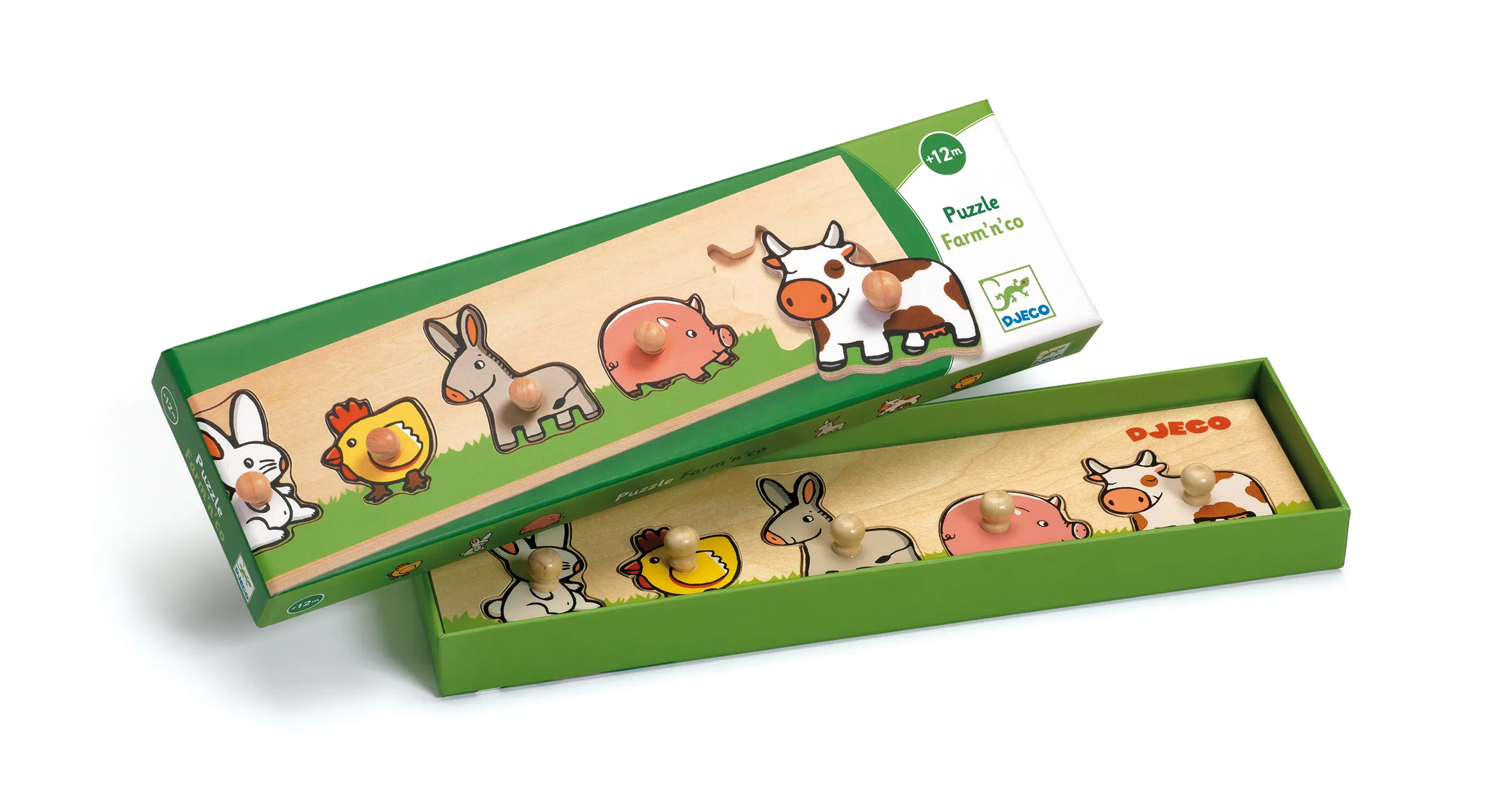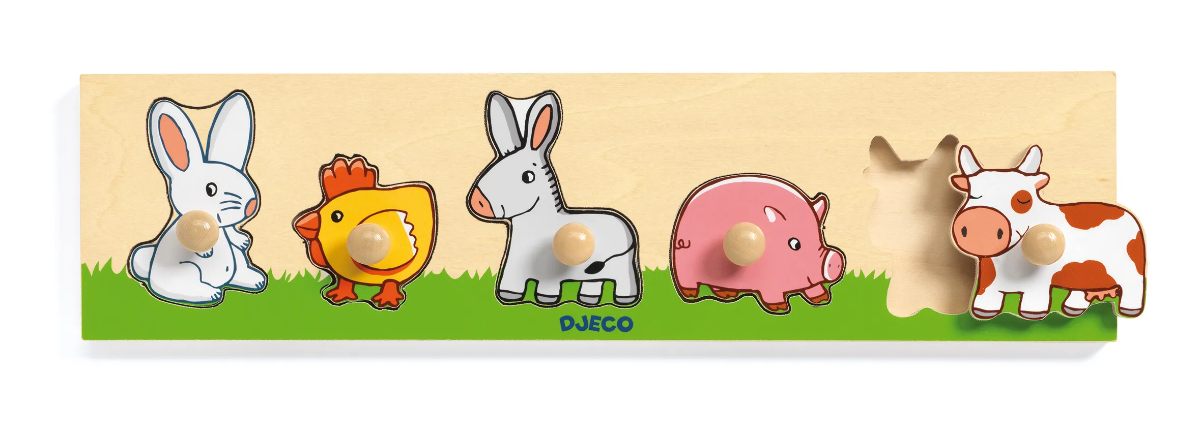 Un puzzle compuesto por 5 bonitos animales de madera de la granja.