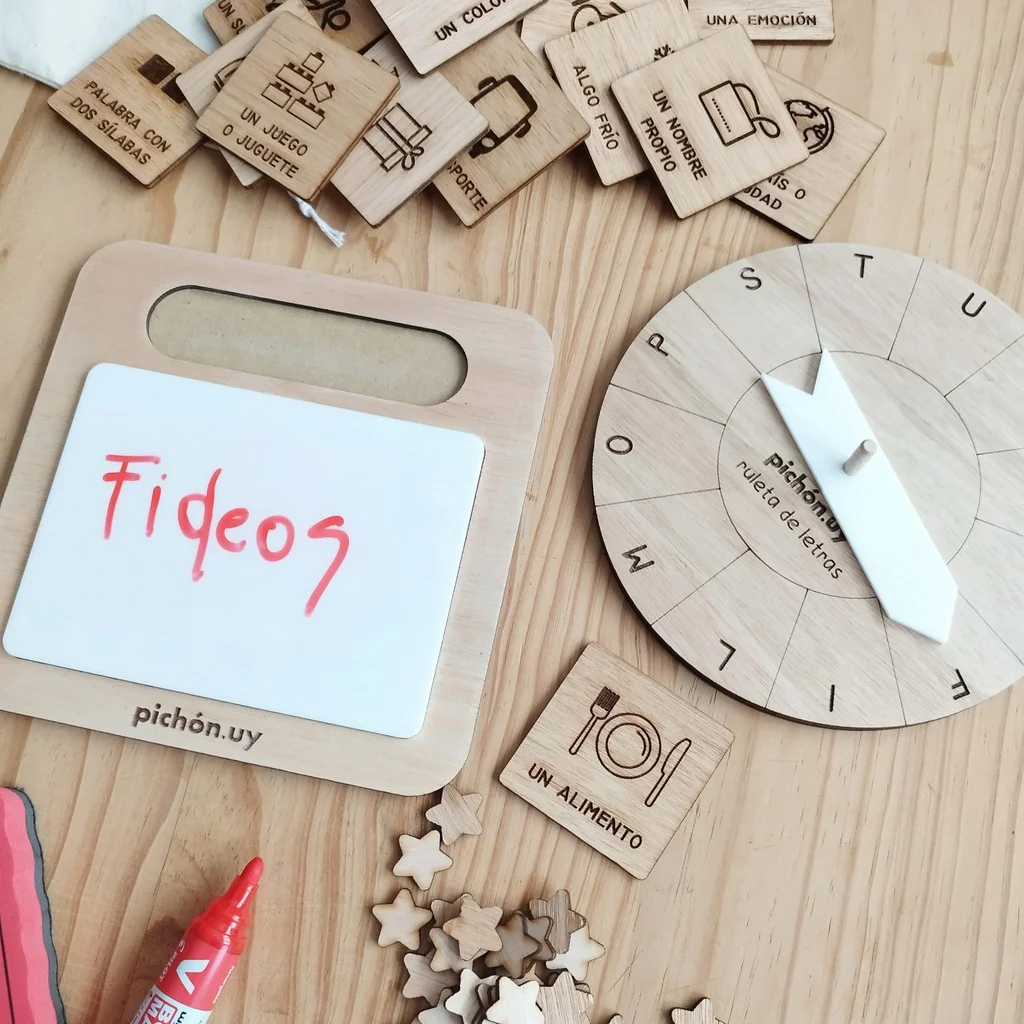 La ruleta Pichón se diseña como parte de sus productos didácticos que acompañan el proceso de lectoescritura y el desarrollo de la conciencia fonológica. Un juego para que en familia se disfrute del proceso de aprendizaje de cada niño. También es un material didáctico que se puede utilizar de forma individual, para que el niño ensaye, desarrolle y practique vocabulario y fluidez verbal.