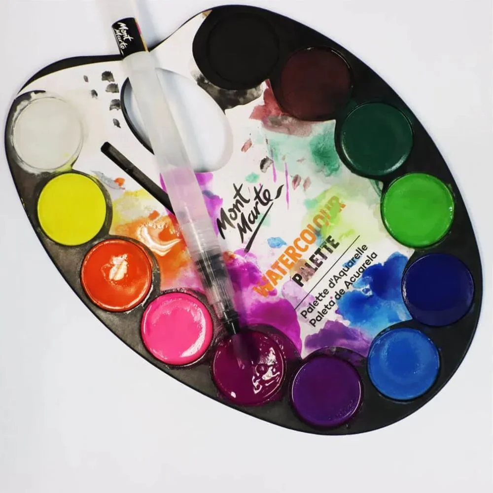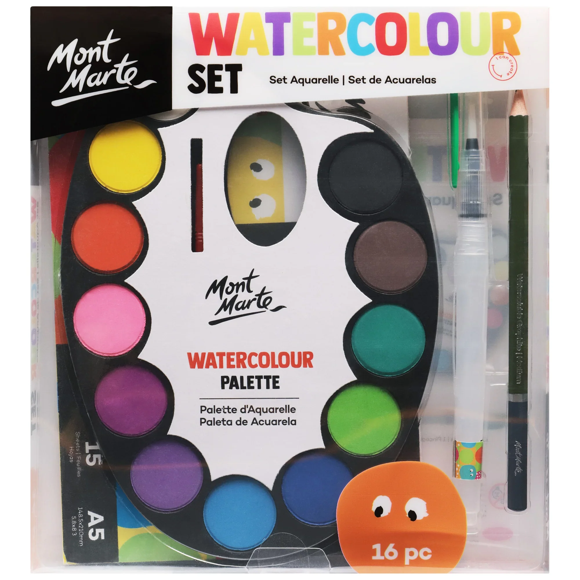 Permite que tu pequeño artista se sumerja en el mundo de la acuarela con nuestro el set de acuarelas de 16 piezas de Mont Marte.