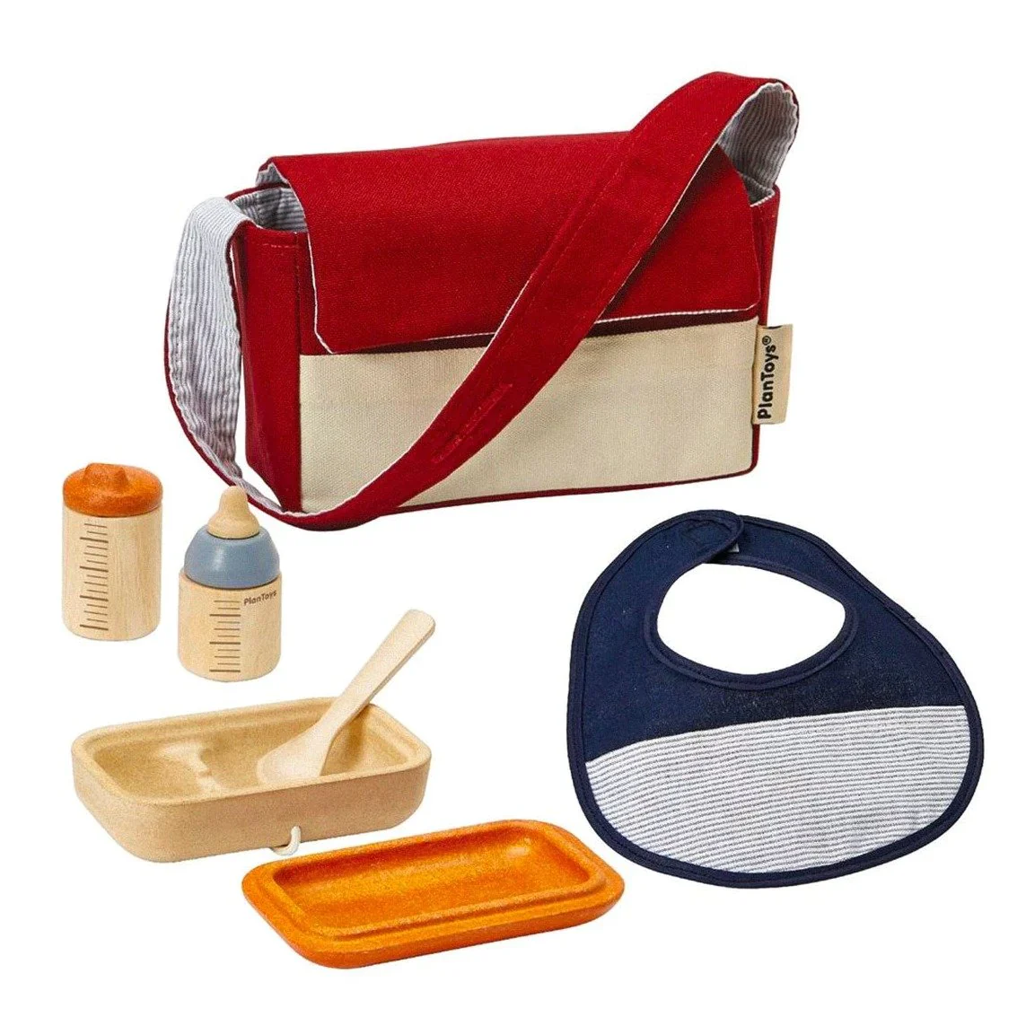 Incluye un bolso portable que se puede colgar en un cochecito o llevar como bolsa. Contiene un recipiente con tapa para alimentos, una cuchara, un babero de algodón, una botella de agua y una mamadera.