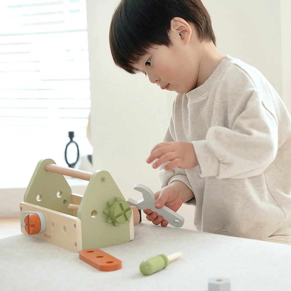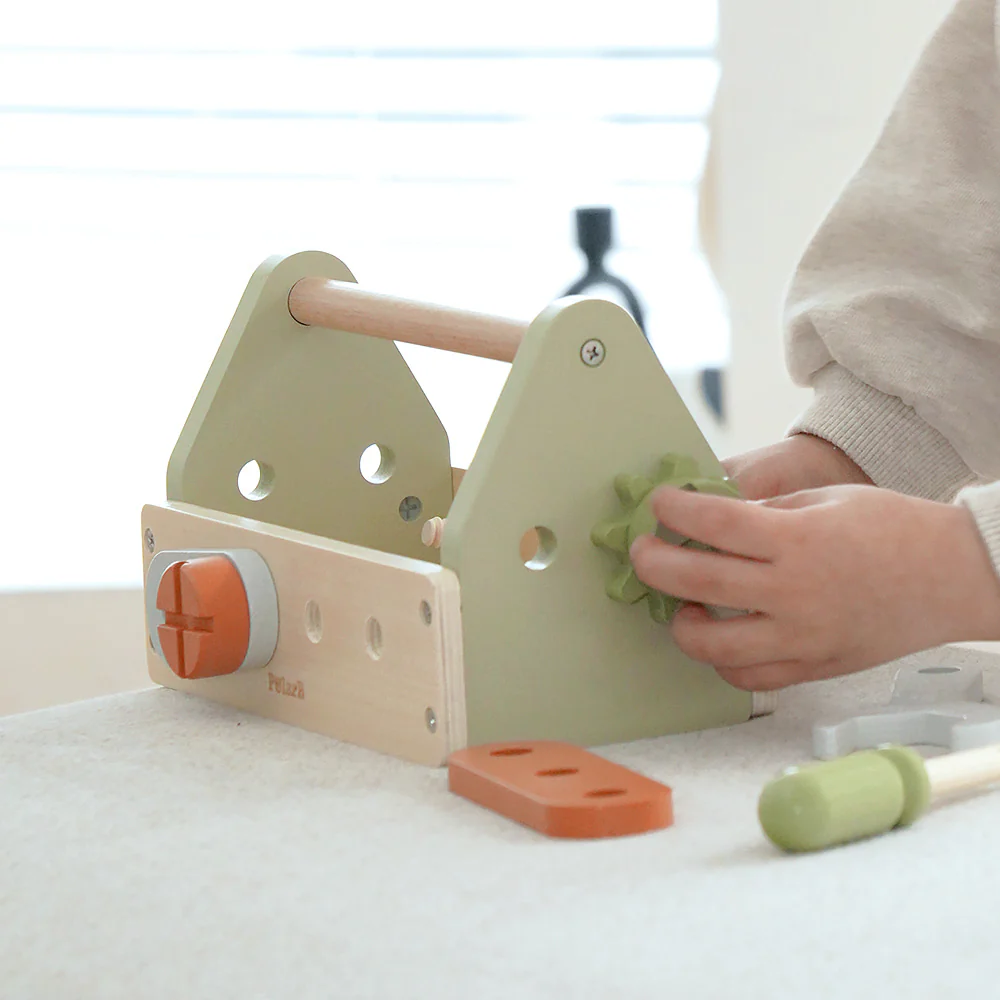 Un juego que invita a imaginar, construir y explorar con las manos. Este set de herramientas de madera en suaves tonos verde pastel es ideal para niños a partir de los 3 años que disfrutan del juego simbólico y de experimentar con el mundo que los rodea.