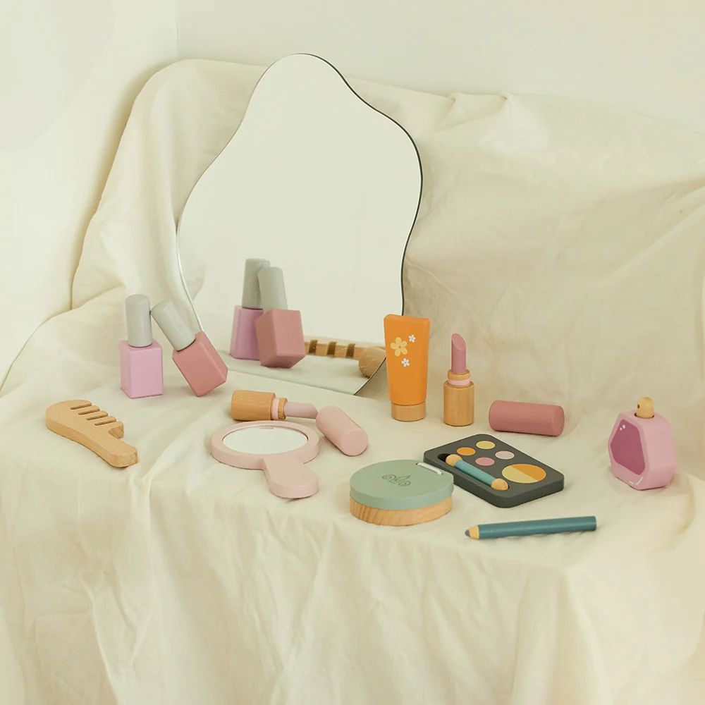 Set completo con piezas de madera como un espejo de seguridad redondo, una paleta de sombras de ojos con aplicador, una caja de polvos con espejo, 2 esmaltes de uñas, 2 labiales, un frasco de perfume, un peine, un tubo y una bolsa para guardar el set siempre.
