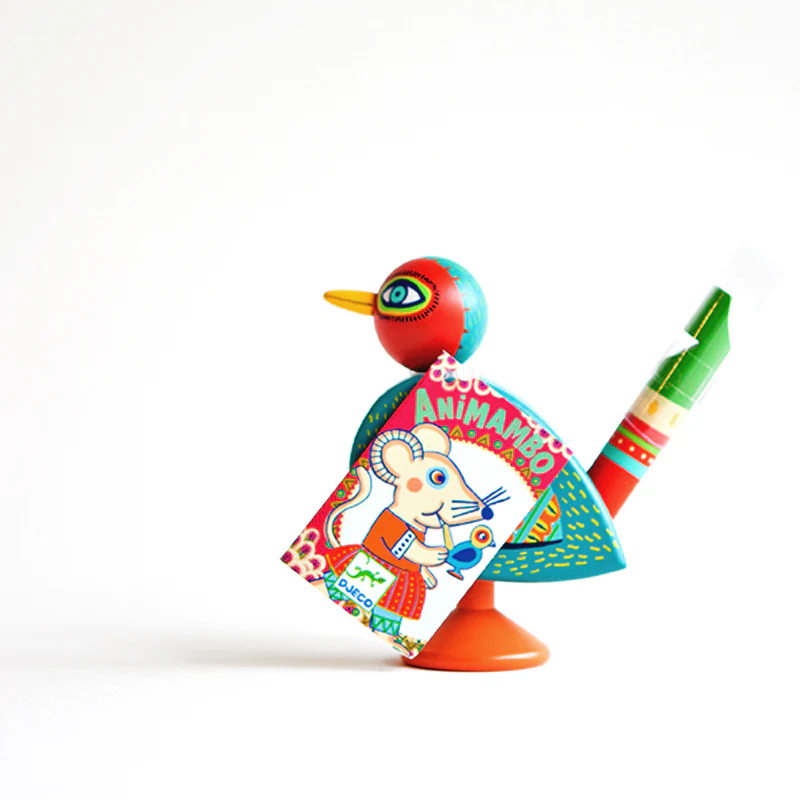 Un silbato con un diseño único de pajarito y con los colores vibrantes que caracterizan a la línea Animambo