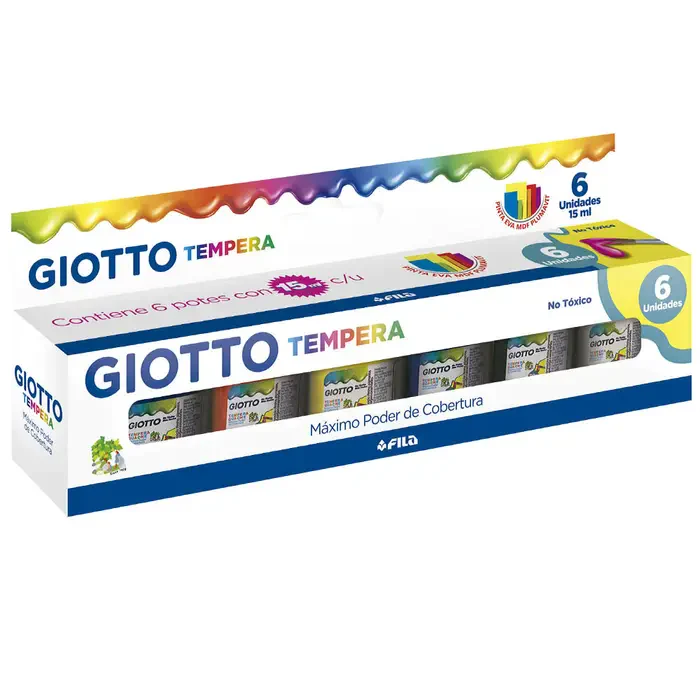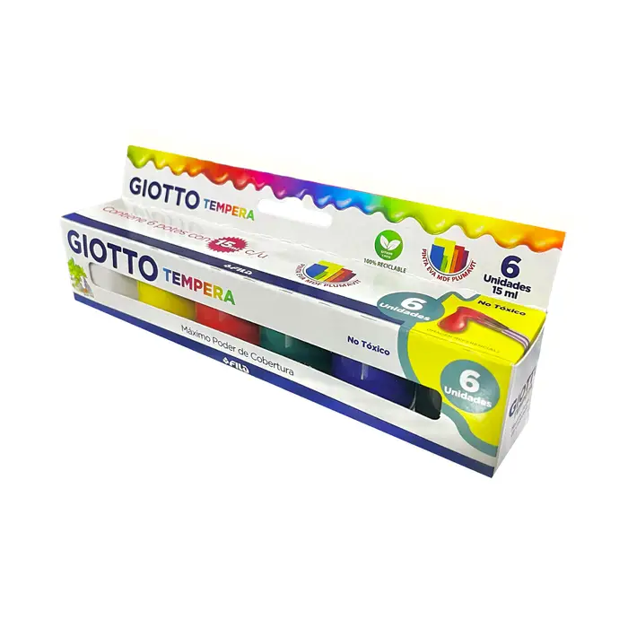 Incluye 6 colores de témpera guache de 15 ml, con máximo poder de cobertura, textura suave y colores intensos.