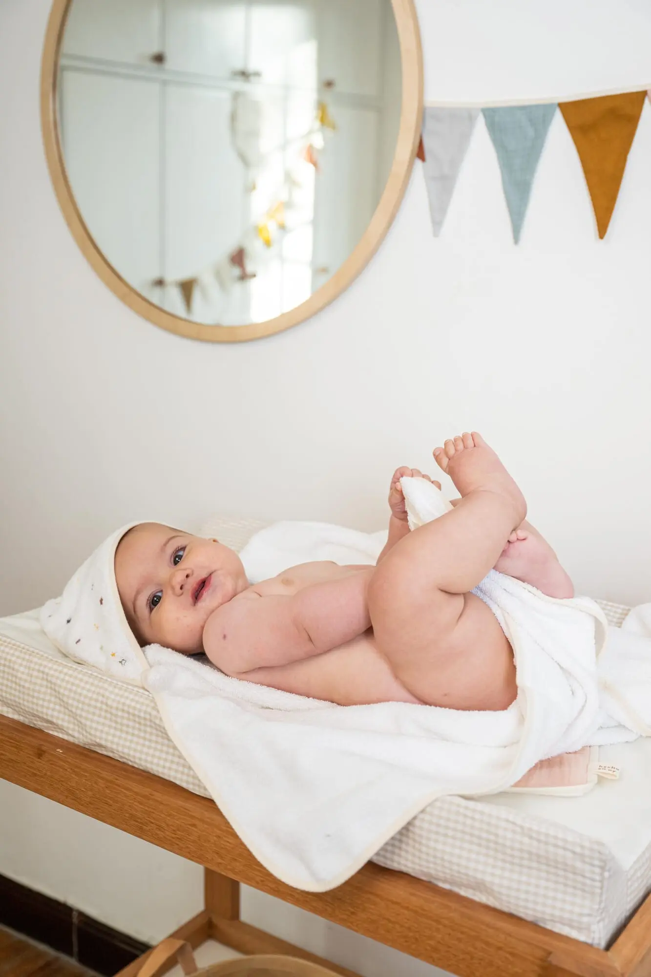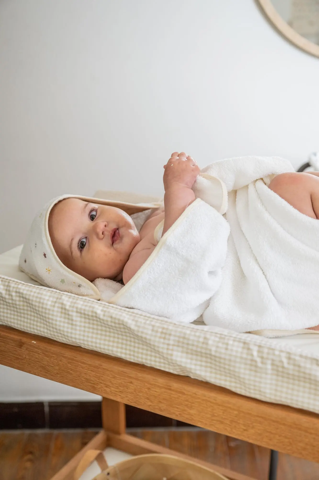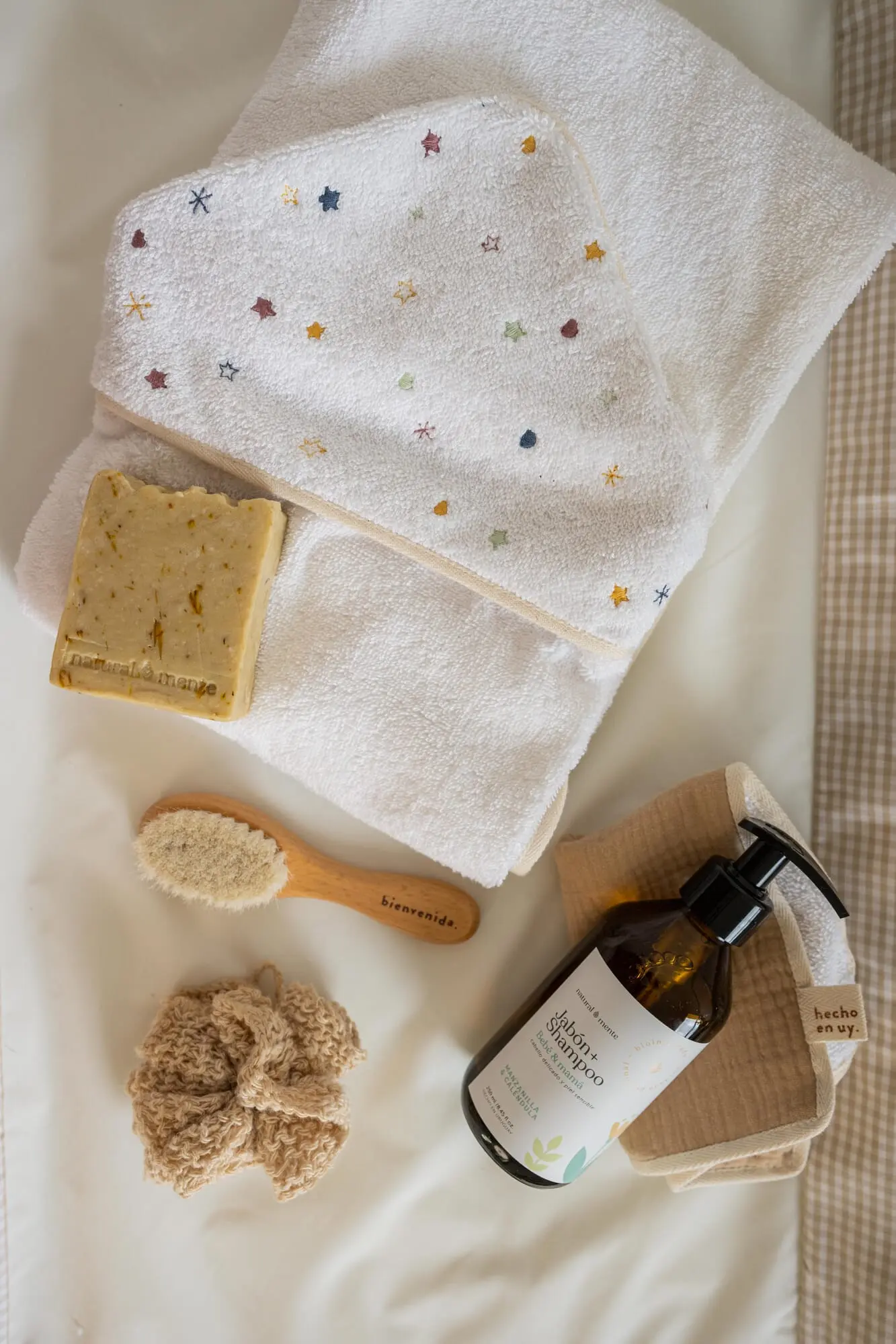 Toalla con capucha forrada y bordado colorido de estrellas. Tamaño bien amplio y calidad de toalla super para que dure muchos baños con tu bebé.