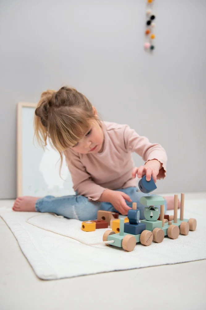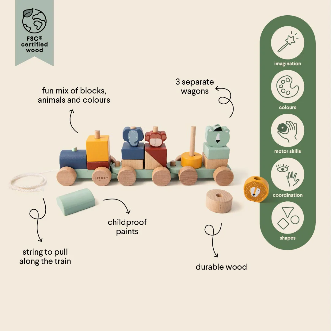 El tren y todos sus elementos están hechos de madera 100% certificada FSC®. Todas las pinturas utilizadas son a base de agua, seguras para los niños y no tóxicas.