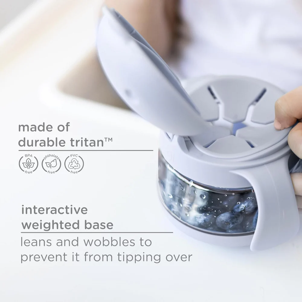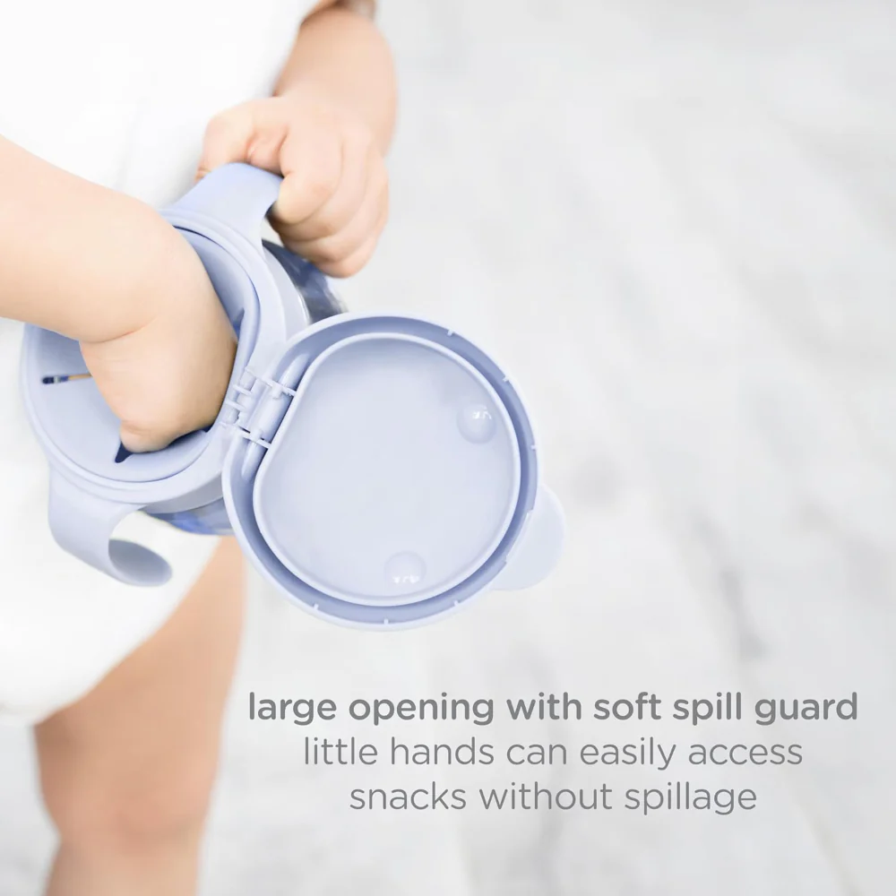 A prueba de derrames, un niño debe tener, equipado con un protector contra derrames suave y extraíble, una gran apertura y asas pequeñas y fáciles de agarrar que fomentan la independencia y la autoalimentación durante la hora de la merienda