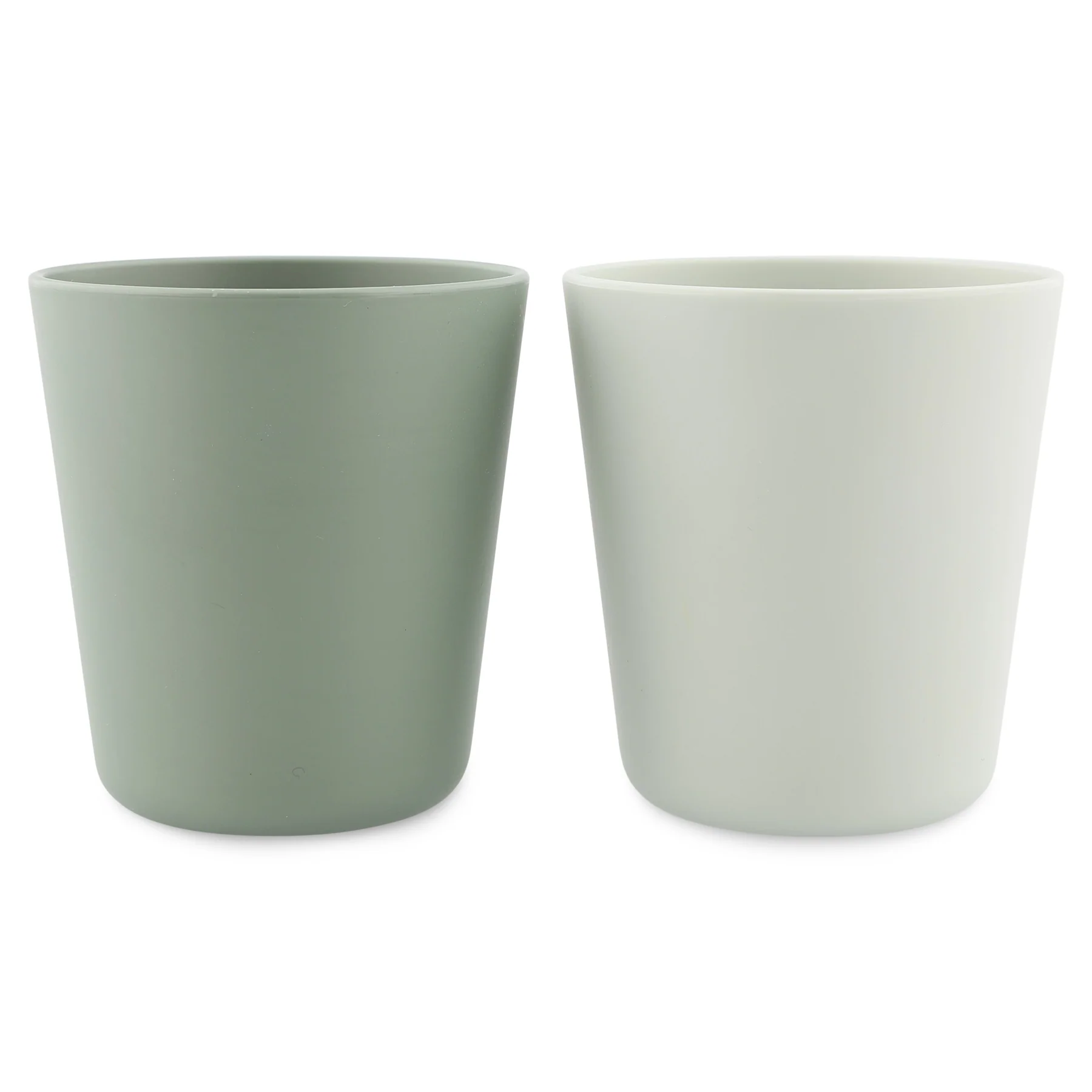 Vasos de un plástico sostenible y seguro, de origen vegetal, parte de una colección del mismo material, que incluye cubiertos, cuencos y platos.