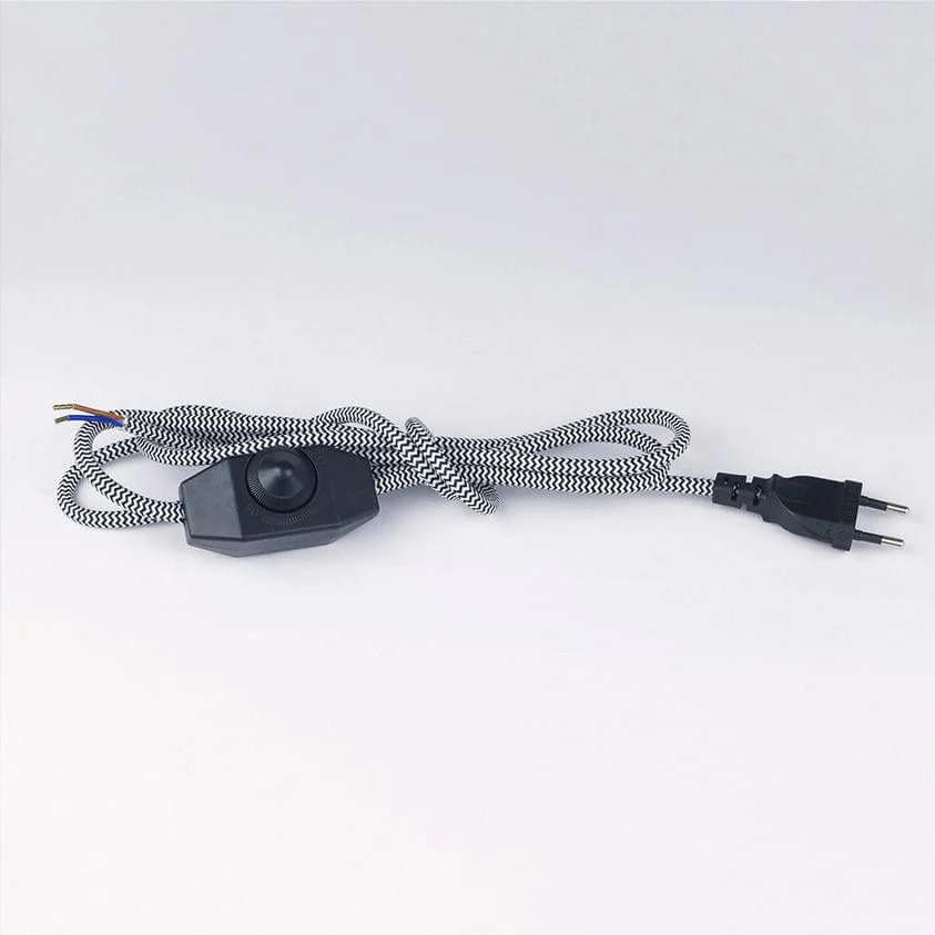 Cable textil blanco y negro con interruptor dimerizable, para que puedas regular la intensidad de la luz como prefieras (viene con lamparita cálida incluida).